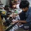 Here, a skilled worker paints dyes on to the jade bangle using a cotton bud. This allows him to precisely create natural looking colour veins and colour patterns.