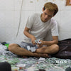 A young man draws out dye concentrates into cups from the mixing station.